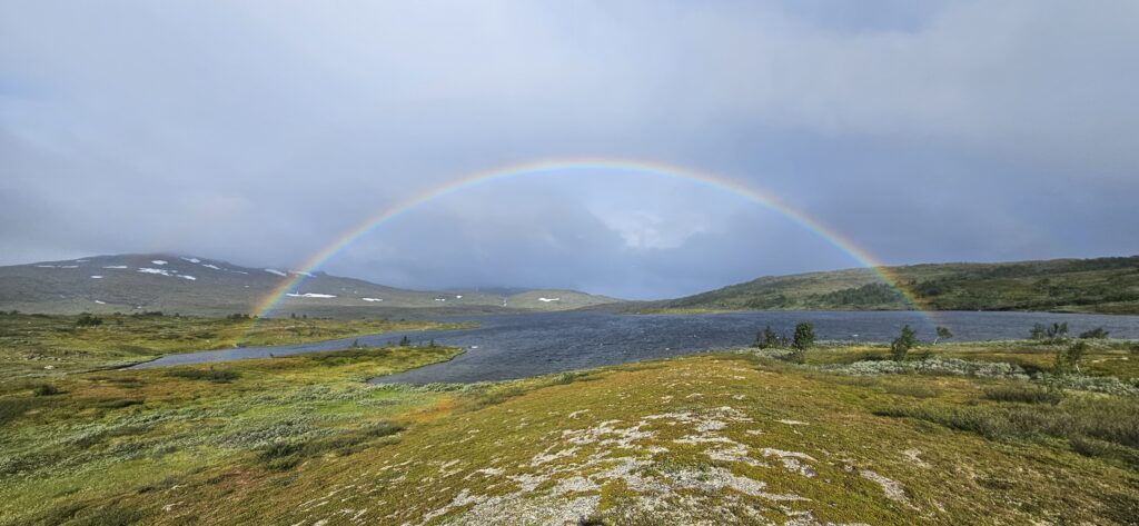 Bevor es ins nächste Tal hinuntergeht, treffe ich zwei ältere Damen aus Schweden. Sie sind unterwegs zu einem See, um dort zu fischen – eine herrlich bodenständige Art, den Tag zu verbringen. Später begegnet mir im Regen noch Teemu, ein junger Finne. Er hat 2024 NPL im Winter auf Ski bewältigt und geht die Tour jetzt im Sommer gleich noch einmal. Ein beeindruckender Typ! (👉 rinkkajapulkka.com)