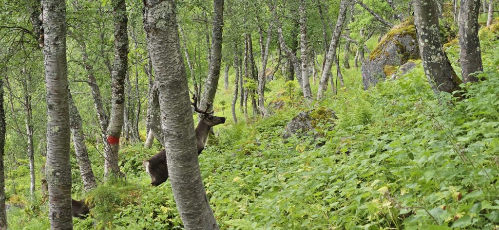 Beim Abstieg zur Nordbucht des Røsvatnet sehe ich erstmals Rentiere im Wald – ein eher ungewöhnlicher Anblick, aber umso faszinierender.