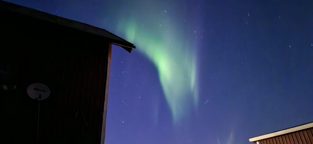 Laut Polarlicht-App gibt es um 23 Uhr eine 50-prozentige Wahrscheinlichkeit, Nordlichter zu sehen. Also halte ich mich mit Lesen wach und stehe pünktlich draußen. Es ist sternenklar – nur von grünem Licht keine Spur. Ich gehe wieder rein, putze mir die Zähne, werfe noch einen Blick aus dem Küchenfenster … und dann: Aurora Borealis! Also nichts wie raus. Mit glänzenden Augen und offenem Mund staune ich.