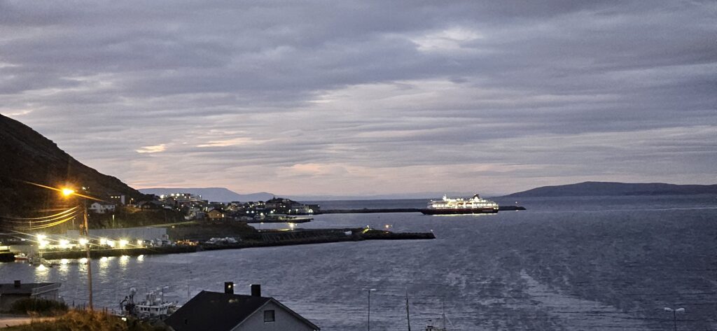 Der letzte Tag auf meinem Norge pa langs Abenteuer bricht an. Um 6 Uhr gehe ich runter in die Küche, dabei sehe ich, wie gerade das Hurtigruten Schiff in Honningsvåg einfährt.