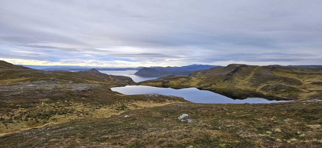 Bei der Haltestelle Sarnespollen steige ich aus. Ein sogar teilweise markierter Weg führt mich durch das Polldal hinauf auf eine Hochebene. Ich drehe mich immer wieder um und schaue raus auf das Meer. Das sind die letzten Kilometer im Gelände, dann werde ich nur noch gute 20 km bis zum Nordkapp auf der Straße zurück legen. Ein bißchen Wehmut ist jetzt schon dabei.