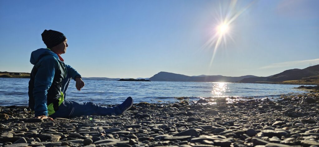 Dann setze ich mich noch in einer Bucht an den Strand, der etwas windgeschützt liegt. Es ist fein in der Sonne. Dann kann ich es doch nicht lassen und fange an schöne Steine zu klauben. Ich kann glatten Steinen einfach nicht widerstehen. Vielleicht war ich ja mal ein Bergtroll in Norwegen. So verschwinden nach schwieriger Auslese drei Stück in meiner Hosentasche.
