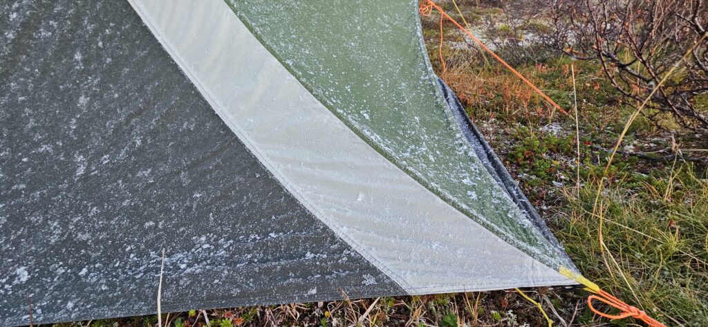 Oh, was für eine Nacht! Als ich um 6 Uhr aus dem Zelt krieche, glitzert das Überzelt voller Eiskristalle. Kein Wunder, dass es sich so kalt angefühlt hat – offenbar hat es in der Nacht kurz geregnet, bevor die Temperaturen unter null gefallen sind.