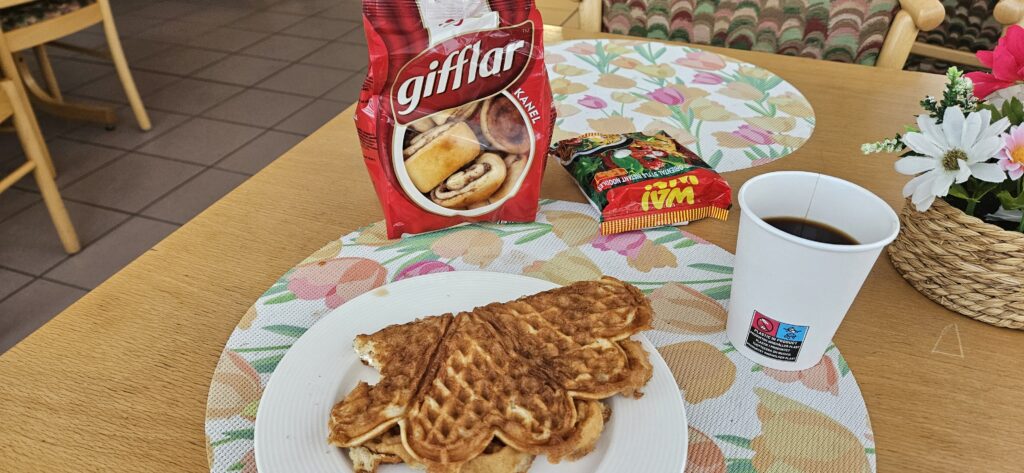 Zum Glück hat der Greisler mit Kaffeecke offen. Und so sitze ich keine 4 Stunden nach dem Startschuss im Trockenen und Warmen bei Kaffee und Waffel. Der Eigentümer ist rührend um mich bemüht und schaut immer wieder mal vorbei, ob ich etwas brauche. Wir unterhalten uns sehr nett. Das ist auch so eine kleine Oase, wo ich froh bin hier zu sein.