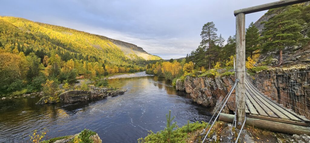 Zunächst überquere ich eine Brücke auf die rechte Flussseite. Der Pfad folgt einige Kilometer dem Reisa, bevor er sich gabelt. Links steigt er den Berg hinauf, hinaus aus dem Tal; rechts könnte man einen Umweg machen, um noch den Imofossen, einen imposanten Wasserfall, zu sehen.
