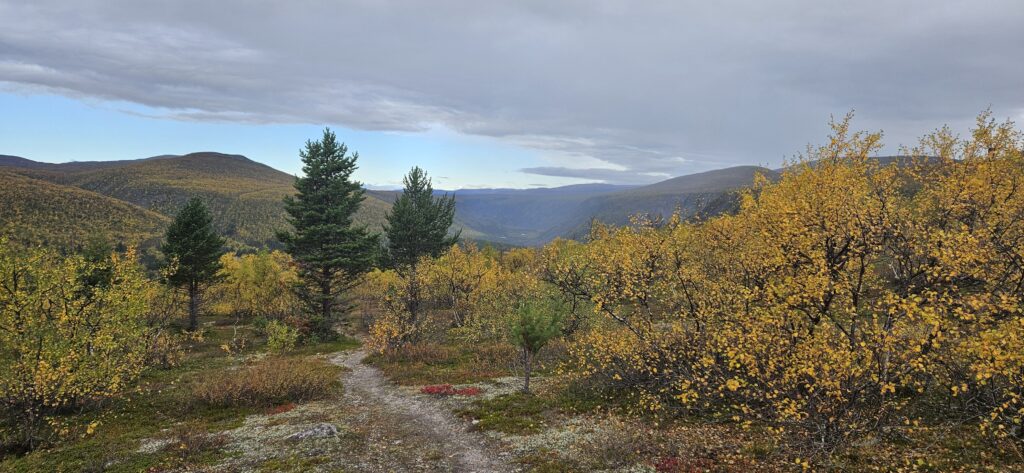Bald verlasse ich das Tal und damit auch den Wald. Von oben öffnet sich noch einmal ein weiter Blick zurück ins Reisadalen, bevor der Weg sich sanft über die Hochebene zieht. Der Untergrund ist angenehm zu gehen, selten sumpfig. Mehrmals müssen Bäche gequert werden, zwei davon rund 15 bis 20 Meter breit – die Füße werden also trotz guter Wege nass.