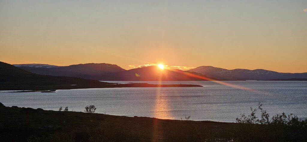 Mit einem warmen Abendhimmel und einem leuchtenden Sonnenuntergang klingt der lange Tag aus – mein erster voller Wandertag in Schweden.